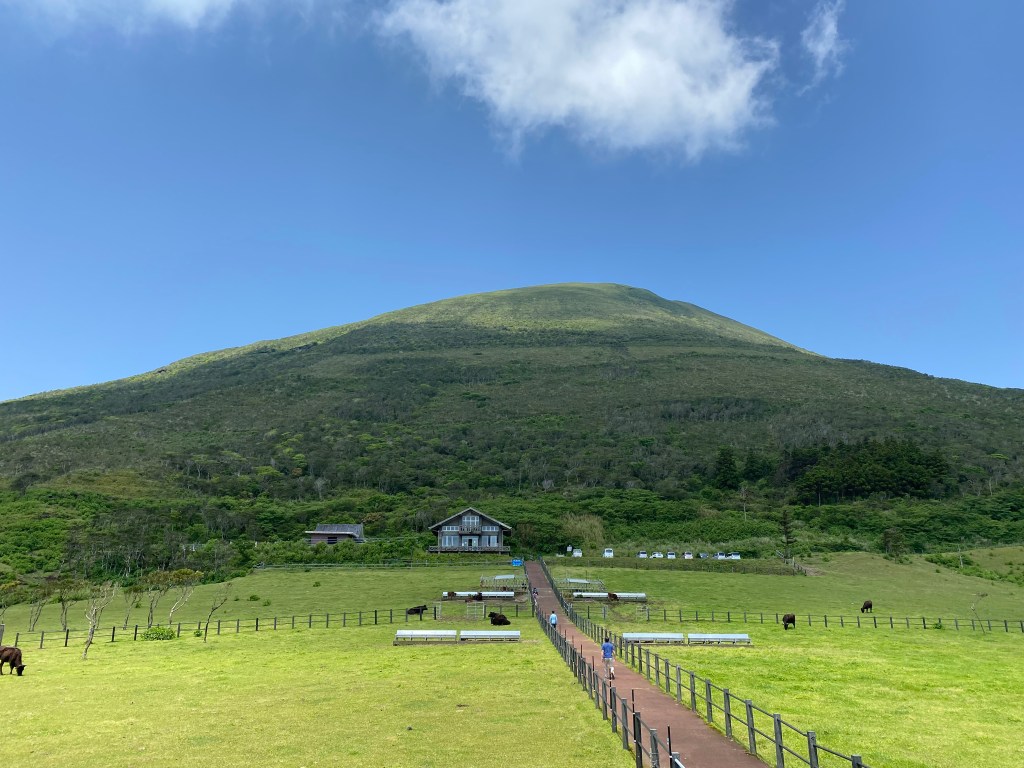 ・ふれあい牧場:八丈富士の中腹 牛が放牧されています。眼下には空港があるため飛行機の離発着も見えます。