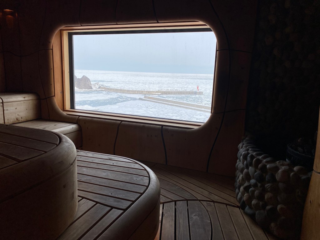 このホテルは流氷を望むサウナも有名で、チェックアウト付近には服を着た状態でサウナの撮影ができるように解放されます。おもしろいですね!