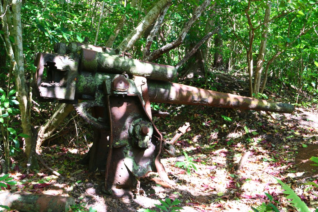 硫黄島のような上陸戦にはならなかったものの、第二次世界大戦ではサイパンと東京のほぼ中間に位置しているため最初の標的となりました。そのため島内には壕やトーチカ、錆びた銃器などが多数あります。
