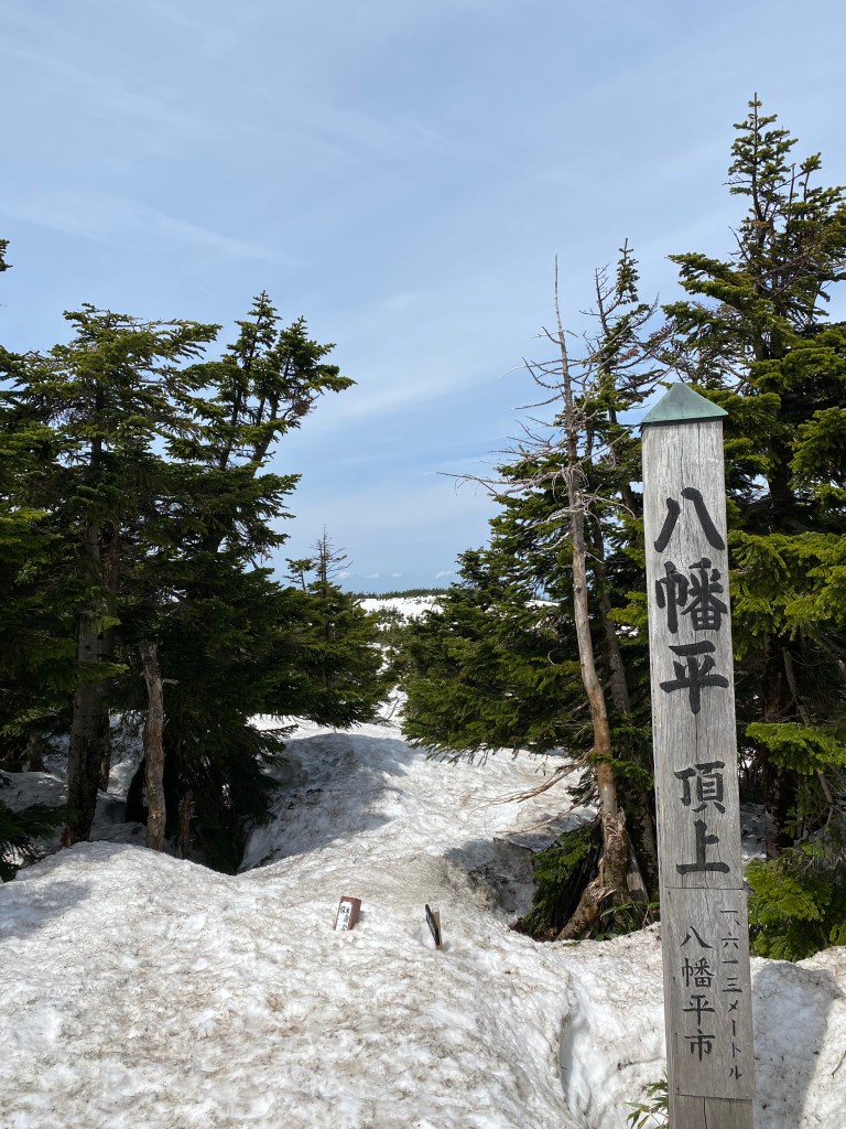 左に曲がらず道なりに進むと約15分で「見返峠」に着きます。ここからは鏡沼は見えませんが、ガマ沼の雪解けしていく湖面が見えます。ガマ沼を横目に15分程度歩くと「八幡平山頂(標高1613m)」に到達します。5月中旬に訪れた際はしっかり積雪していたため、スノーシューズで登ることをオススメします。一面白銀の世界のため足跡や木に結ばれている目印などを頼りに迷わないように気を付けてください。山頂からそのまま道なりに下ると「めがね沼」と「鏡沼」が見えてきます。