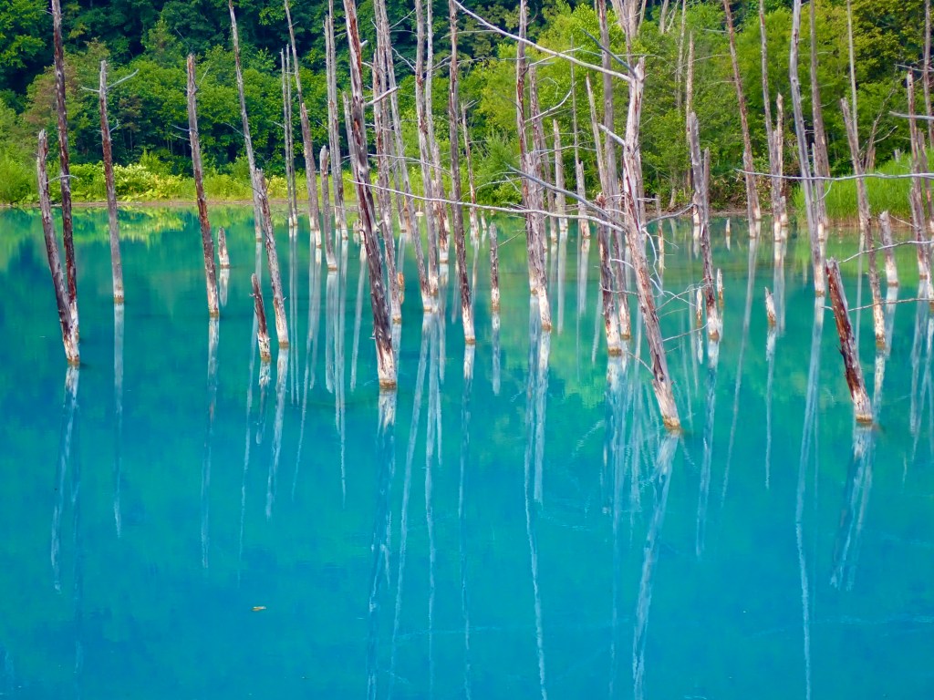 気候によってその青さが変化します。青くなる理由は「アルミニウム」にあります。白ひげ滝から流れる水に含まれるアルミニウムが美瑛川の水と混ざり合い、コロイドが形成されることで太陽光を乱反射し青く見せます。