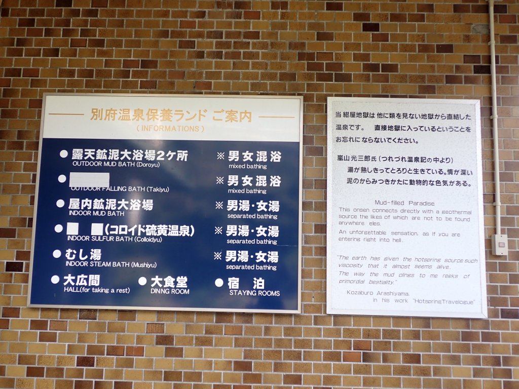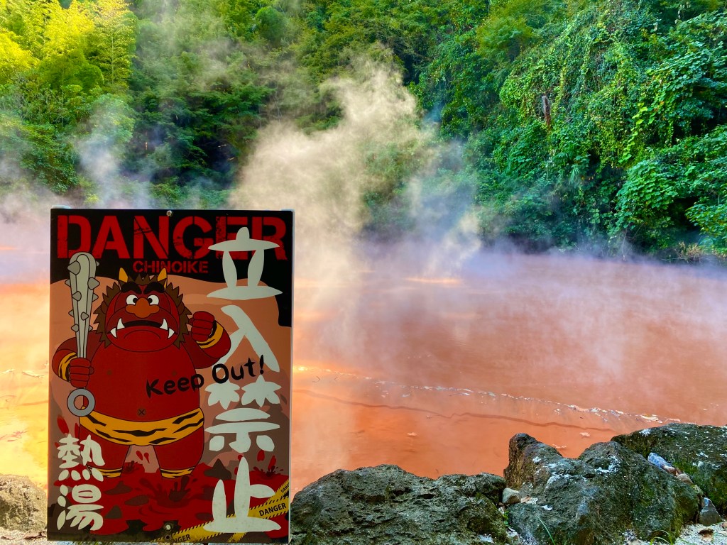 一番地獄っぽい赤い熱泥の池です。赤いのは酸化鉄と酸化マグネシウムなどを含んだ赤い熱泥が地層から噴出・堆積しているかだらそうです。この泥で作られた軟膏もここでのみ販売されています。鬼グッズが豊富なお土産と足湯もあります。