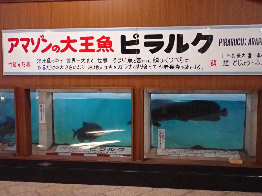 もともとは透明な温泉が池に落ちると圧力・温度の低下で白く変化すのだとか。和風庭園の池とアマゾンに生息するピラクルがいる熱帯魚館。不思議な組み合わせです・・・