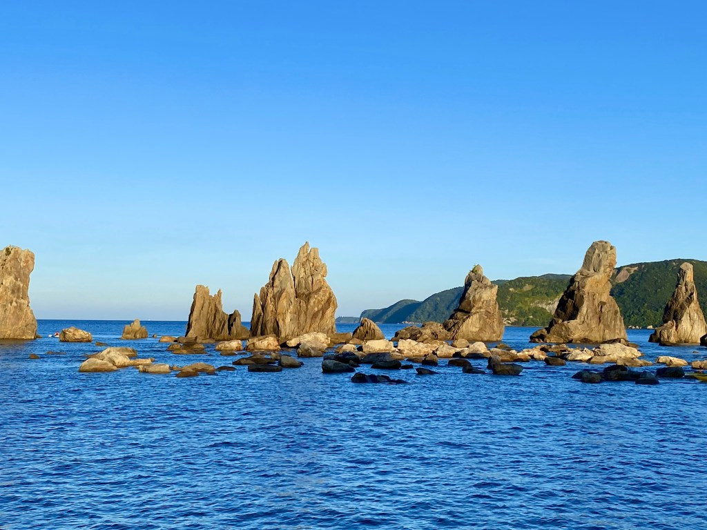 海の浸食で岩の固い部分だけが残った大小40あまりの岩柱で国の天然記念物となっている。道の駅の前であり、干潮時には間近で見ることもできます。満潮時はカヤックツアーで上陸なども開催されているようです。