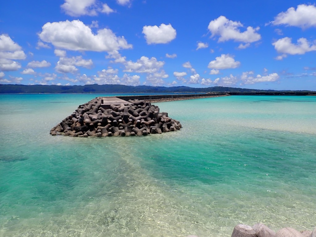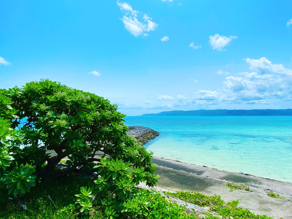 集落の目の前!透明度は抜群で大潮の干潮時には防波堤まで歩いて行けるほど潮が引くときもあり、沖へかけての海の色のグラデーションが絶景です。道沿いにはアダンもあり、南国感満載!