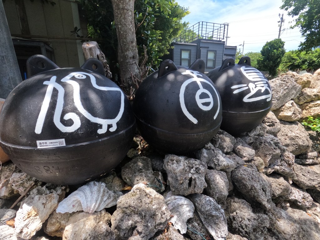 顔や「鳩間島」などが書かれた浮き玉も鳩間名物の1つ。簡易郵便局前あたりの石垣の上に並べられています。