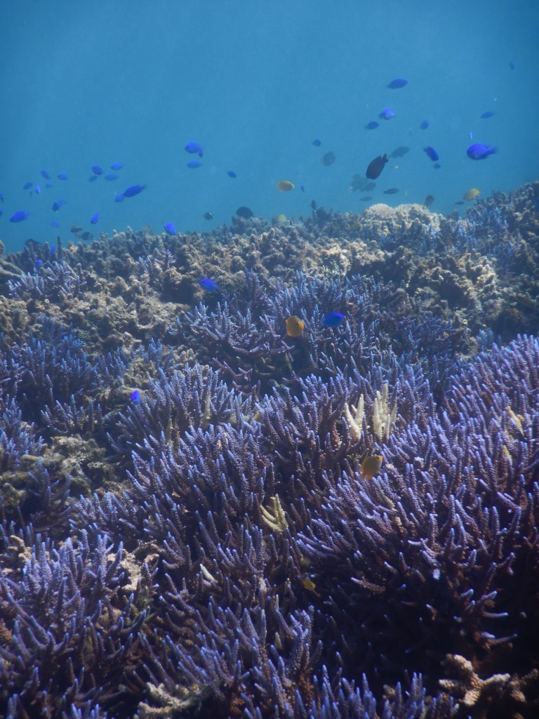 石垣島側のビーチ沖にはユビエダサンゴのポイントがありますが、ビーチエントリーではやや危ないと思われます。何度行っても透明度はあまりよくないです・・・