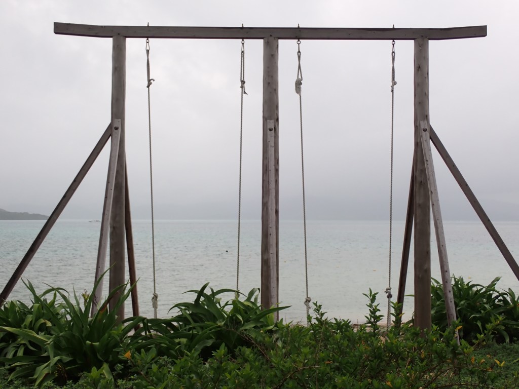 桟橋近くにある海を臨むブランコ。天気が良ければインスタ映え間違えなしです!写真はあいにくの曇天でした・・・