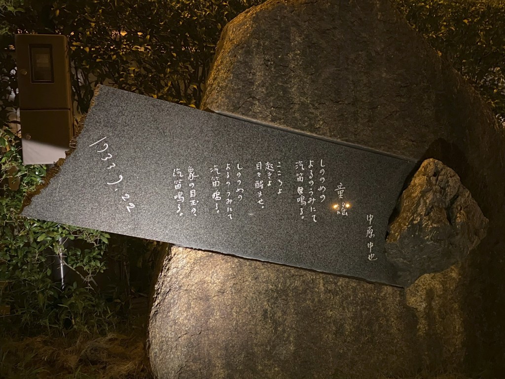 湯田温泉出身の近代文学を代表とする詩人・仲原中也の生家跡に記念館が建てられました。草稿や遺書などの貴重な資料が公開されています。道沿いにも碑があるため探してみてください。