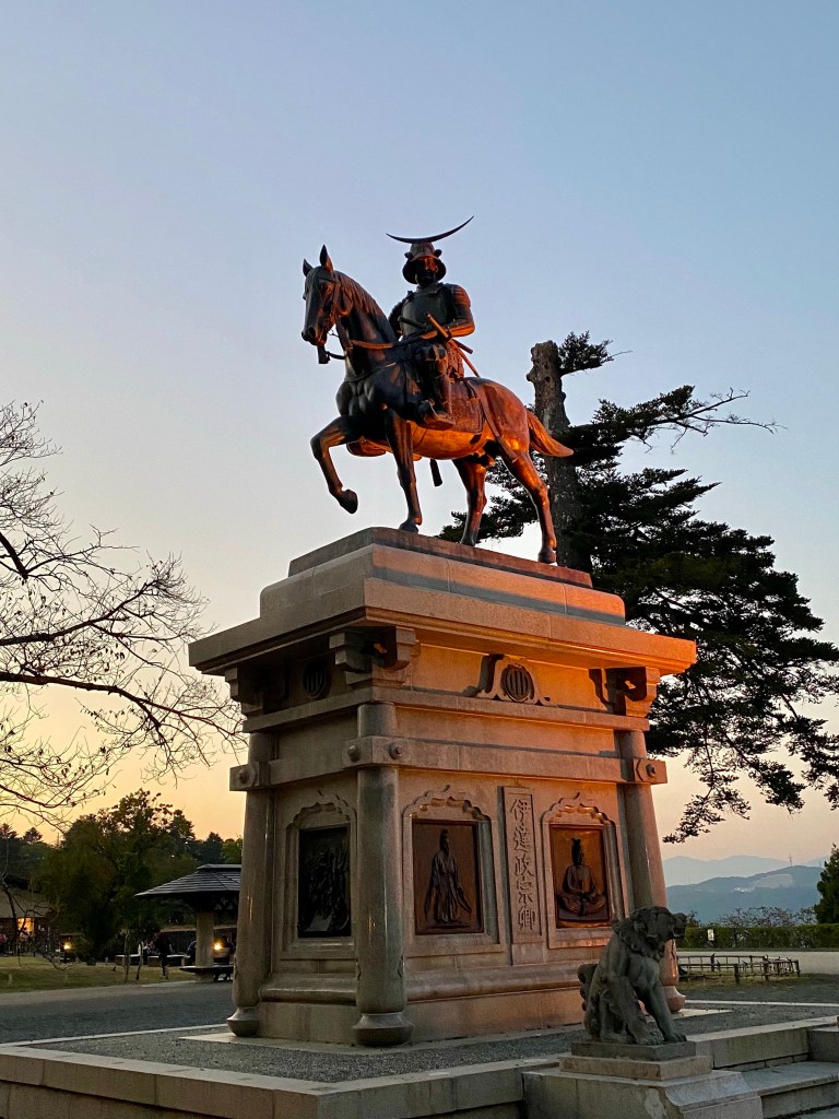 一番の見どころは、伊達政宗公騎馬像です。青空に映える姿もかっこいいですが、夕暮れ時も天気が良いときは日の入り時間ちょっと前に行くのもオススメです。ライトアップされており、シルエットがかっこいいです。仙台市内の夜景も一望できます。この時間はるーぷるの最終が出てしまっているため、帰りは国際センター駅まで徒歩になってしまいますが、下りのため登りよりはましです・・・