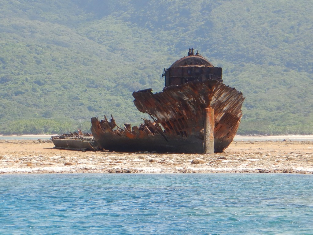 竹富町字高那の沖、ユツン川付近に架かる橋の上からも見えますが、カヤックなどでも上陸することができます。40年位前?に座礁した船だそうです。