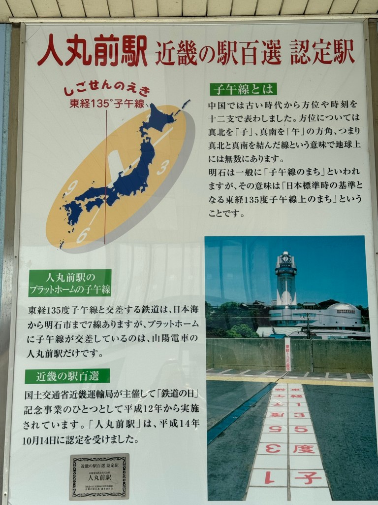 子午線の最寄り駅である人丸前駅。駅のホームにも子午線があります。