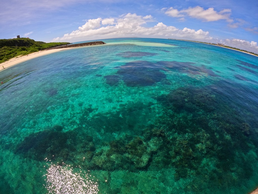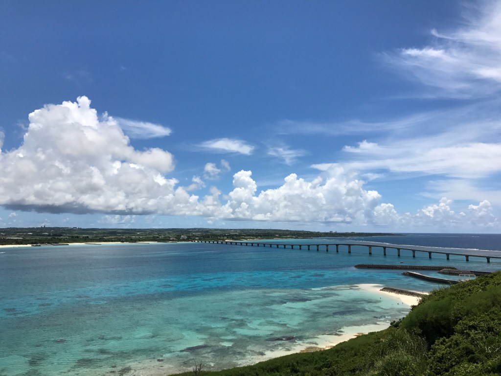来間大橋を渡ってスグのビーチで、SUPやダイビングの練習をしている方々がいたりします。遠浅なので海水浴や堤防の上でのんびりするにはちょうど良いです。対岸は与那覇前浜ビーチです。