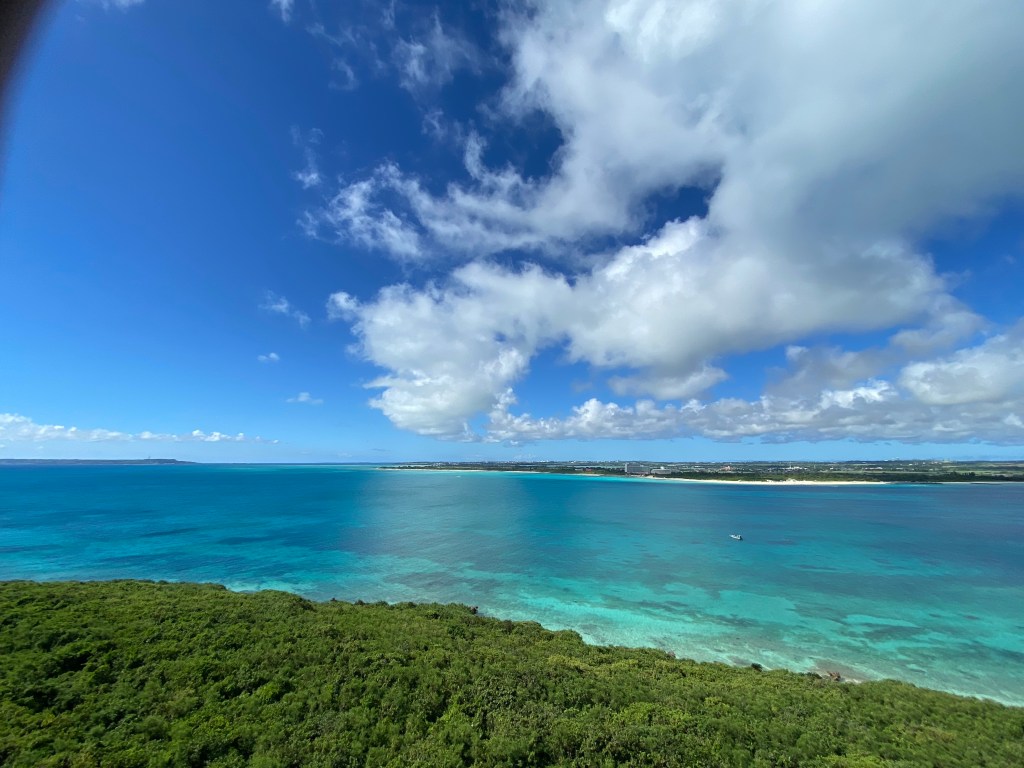 来間ブルーの海を眺めるにはベストスポット!冬~春にかけては手前に養殖モズクがバッチワークのように見えます。