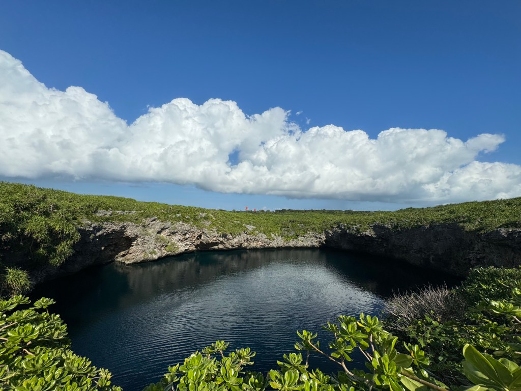 遊歩道を挟み写真の池ともう1つ池があります。一見2つの池に見えますが、実は地下で繋がっている有名なダイビングスポット。海側の池は洞穴で海とも繋がっています。