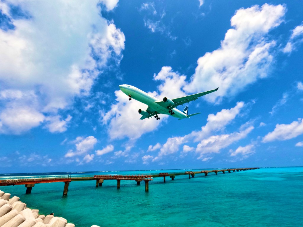 下地島空港の滑走路番号は17と35で下地ブルーの海に張り出す誘導灯が17END、中の島に近くのフェンスがある方が35ENDです。17ENDは美しい海と高度を下げた飛行機が同時に見れるポイント!夏は比較的17ENDから着陸することが多く、北風が強くなる冬は35ENDからの着陸が増えます。誘導灯あたりでは頭上に高度を下げた飛行機が飛んでいくという、他ではあまり味わえない体験もできます。真下もいいですが、写真を撮るなら横からも捨てがたい・・・