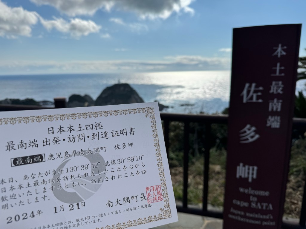 佐多岬灯台を望む展望台。天気が良ければ硫黄島や種子島も見えます。最南端の碑は2か所あります。