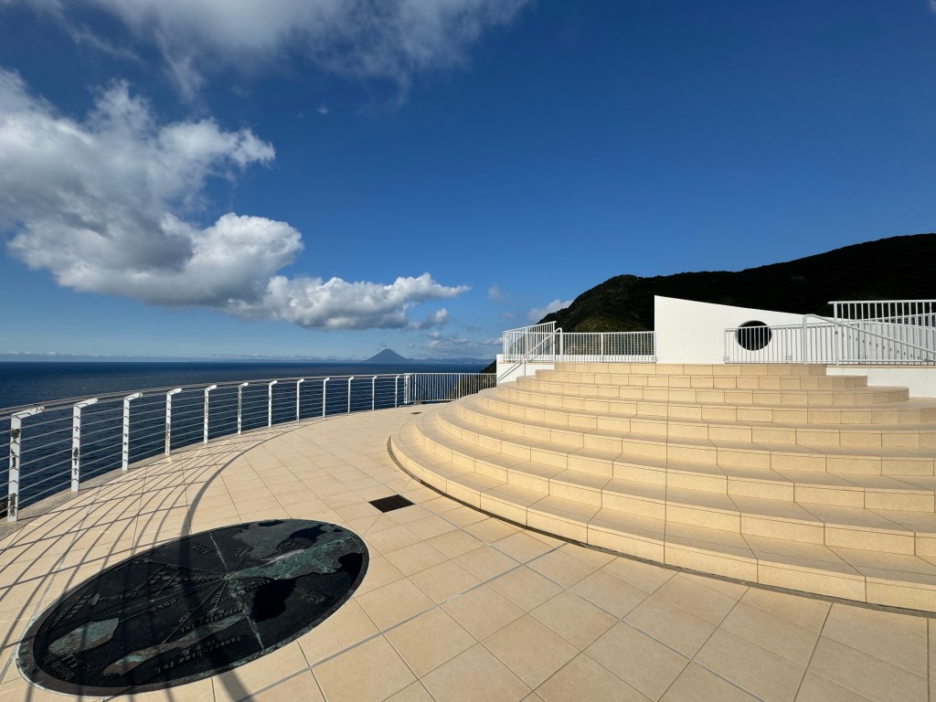エントランス広場のちょっと前にある展望台。灯台は見えませんが、南国らしい海岸線と北緯31度線のモニュメントが映えスポットです。